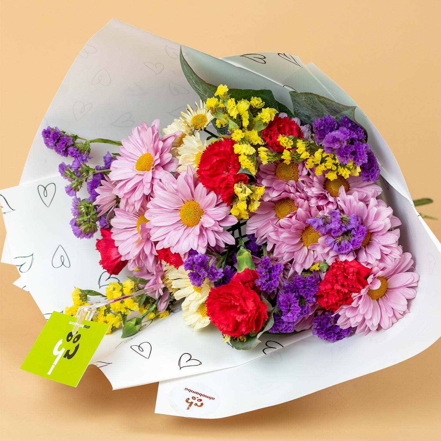 Este ramo floral combina suavidad y pasión en una armonía perfecta en tonos morado, rosado y amarillo.